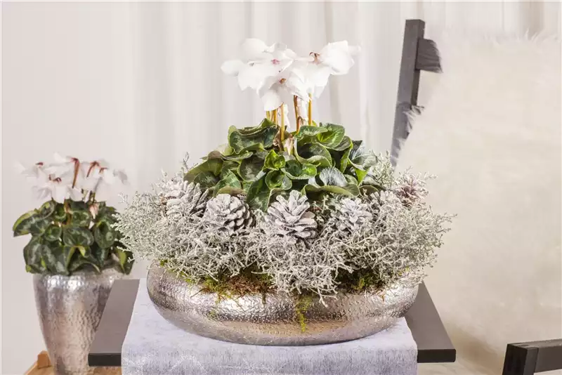 Zu den schönsten blühenden Wundern in der Weihnachtszeit gehört das Alpenveilchen (Cyclamen persicum). Mit ihren erhabenen Blüten in den Farben Rot, Weiß, Rosa, Pink und Violett und auch zweifarbigen Sorten lässt sich das Alpenveilchen auf vielfältige Weise in die weihnachtliche Dekoration einbinden. Vor allem die Blüten in einem festlichen Rot oder Weiß, die an zarte Schneeflocken erinnern, eignen sich besonders gut für eine klassische Dekoration. Alpenveilchen lieben einen hellen und kühlen Standort. Während der Blüte benötigen sie ausreichend Wasser, dennoch sollte Staunässe vermieden werden.