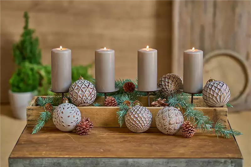 Früher hat man den Weihnachtsbaum mit Äpfeln geschmückt. Nach und nach wurden die Äpfel dann durch gläserne Kugeln ersetzt. Heute gibt es die Weihnachtskugeln in vielen unterschiedlichen Varianten, ganz klassisch einfarbig oder mit einem auffälligen Dekor – ganz nach Ihren Vorlieben. Mit diesem Kerzenständer aus Holz und erhöhten Schalen kommen Ihre Adventskerzen stilvoll zum Ausdruck. Der Kerzenständer sorgt pur oder mit weihnachtlichen Dekorationselementen für eine gemütliche Weihnachtsstimmung.