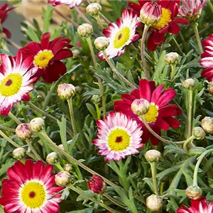 Die Strauchmargerite oder auch bekannt unter ihrem wissenschaftlichen Namen Argyranthemum frutescens ist eine echte Sommerpflanze aus der Familie der Korbblütler und ist im mediterranen Klima der kanarischen Inseln beheimatet, wo sie wild wächst. Mit den Wiesen-Margeriten aus unseren Breitengraden ist die Strauchmargerite zwar verwand, stellt aber eine eigene Gattung innerhalb der Margeriten-Familie dar.