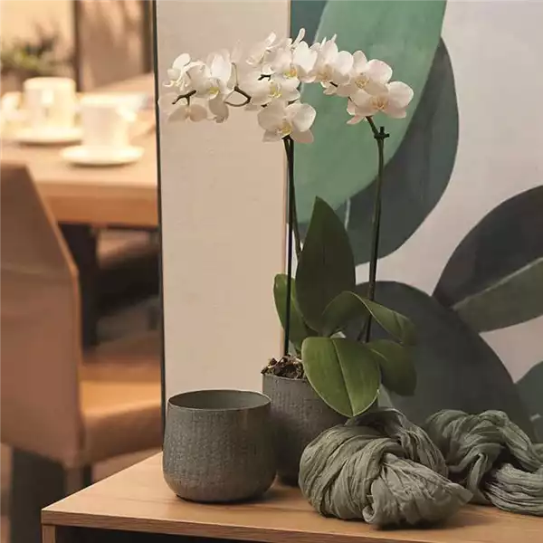 Mit langen Blütenrispen und dicken grünen Blättern ist die Schmetterlingsorchidee (Phalaenopsis multiflora) ein Pflanzenstar in unserem Wohntrend „Green Emotion“. Die weiße Blütenfarbe, kombiniert mit passendem Übertopf, verleiht jedem Einrichtungsstil einen unverwechselbaren Charakter. Sie liebt einen hellen Platz, aber kein direktes Sonnenlicht und Durchzug.