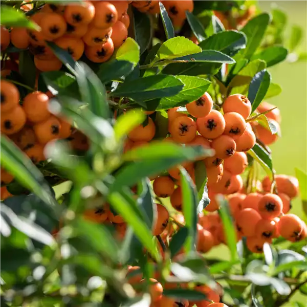 Feuerdorn (Pyracantha) ist ein besonders dekoratives immergrünes Gehölz, das gerne auch als Heckenpflanze verwendet wird. Die Fruchtschmuckpflanze gehört zur Familie der Rosengewächse und bildet eine dichte Krone. Die vielen erbsengroßen Beeren des Feuerdorns sind bis weit in den Winter hinein ein Blickfang und wertvolle Vogelnahrung. Das Farbspektrum, der ab September reifenden Früchte, umfasst die unterschiedlichsten Gelb-, Orange- und Rottöne und macht den Feuerdorn zu einer Augenweide im herbstlichen Garten. Er steht gerne in der Sonne, denn hier kann er seine Blüten- und Fruchtansätze komplett entfalten. Aber auch im Halbschatten fühlt er sich wohl.