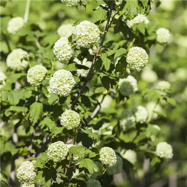 Als Ziergehölz mit einer wunderschönen Blüte und einer unglaublichen Herbstfärbung schmückt der Schneeball (Viburnum opulus 'Roseum') bereits seit Ende des 16. Jahrhunderts unsere Gärten. Heutzutage ist er ein Klassiker in Bauerngärten. An einem voll-sonnigen Platz oder im lichten Halbschatten kann der winterharte Großstrauch eine Höhe und Breite zwischen 3 - 4 m erreichen. Im Mai und Juni wird der Strauch von unzähligen gefüllten, weißen Blütenbällen bedeckt. Die Blüten bieten (Wild-)Bienen und vielen anderen Insektenarten wertvollen Nektar und Pollen. Bevor diese verblühen, färben sie sich zartrosa.