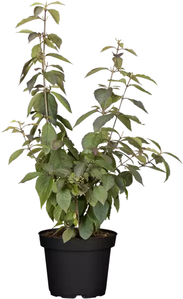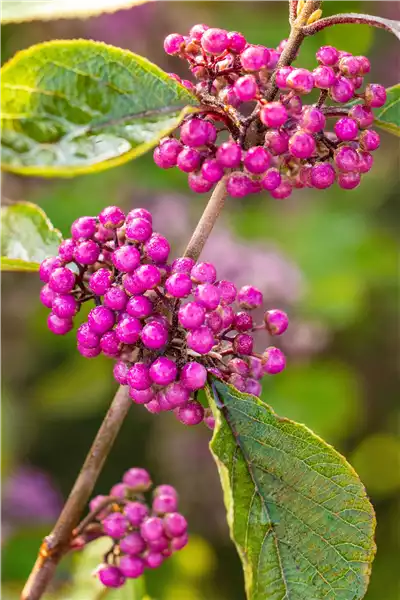 Der Liebesperlenstrauch (Callicarpa bodinieri 'Profusion') hat seinen Namen den von Kindern geliebten Liebesperlen zu verdanken, da sie den pfefferkorngroßen, lilafarbenen Früchten stark ähneln. Aufgrund dieser glänzenden Früchte wird er auch Schönfrucht genannt. Seine Blüten werden während der Blütezeit im Juli/August gerne von Insekten angeflogen. Wenn sich ab Herbst dann die anderen Pflanzen auf die kalte Jahreszeit vorbereiten, verzaubert Sie der Strauch mit seinem schönen Farbspiel. Vögel nutzen die lila Beeren gern als Winterfutter. Der Liebesperlenstrauch wächst bis zu 2 m hoch und kann als Einzelpflanze, in der Gruppe als Sichtschutz oder im Kübel gepflanzt werden. Wählen Sie für ihn einen geschützten, warmen und sonnigen Standort in humusreichem, durchlässigen Boden.